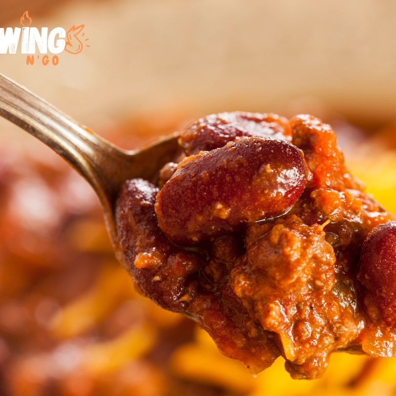 Carne molida sazonada con especias al estilo Wings N Go, frijoles, tomate y ese picantito justo que te hace volver por más. Servido calientito, espeso y con todo el sabor que esperás de un chili hecho como se debe. Perfecto solo, con papas, o como combo con tu orden de alitas.