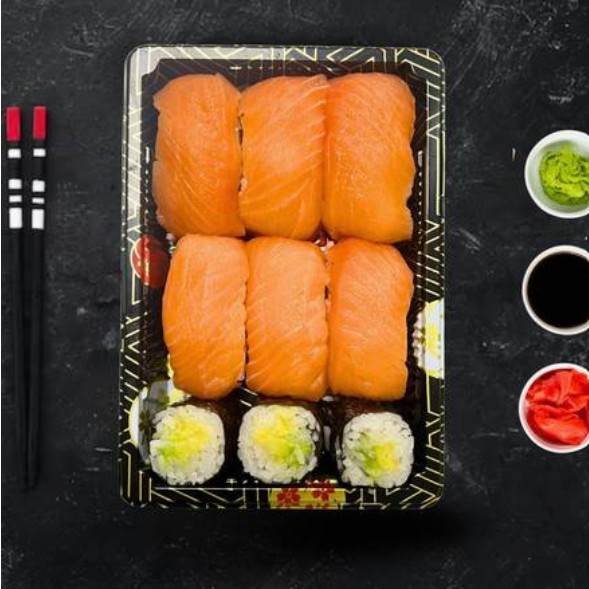 6 Nigiri salmón y 3 maki pepino.