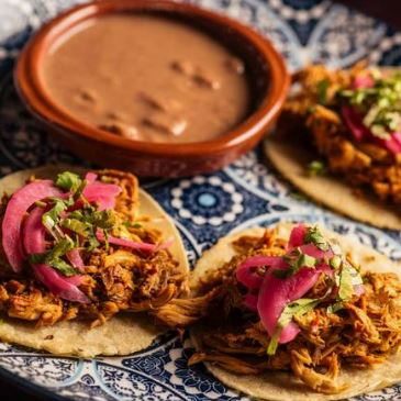 Tradicional de la península de Yucatán, 3 tortillas palmeadas con carne de cerdo adobada en jugo de naranja, especies, cocida a fuego bajo hasta obtener una textura suave, viene acompañado de cebolla encurtida y frijolitos molidos.