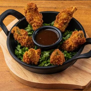 Tiras de aguacate empanizado, acompañado de aderezo de la casa. Una botana perfecta para dipear y compartir.