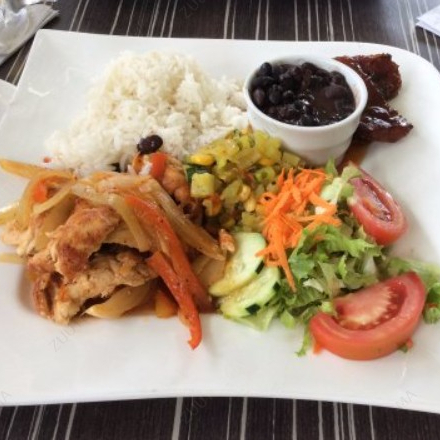 Porción personal de arroz (mexicano), frijoles rojos, plátano maduro, ensalada de la casa (verde), fajitas de pollo.