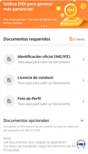 *Los documentos requeridos para el alta de conductor pueden variar por ciudad, para confirmar acude a tu centro de conductores más cercano o comunícate a nuestra línea de atención disponible 24/4 800 725 8888.