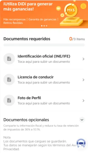 *Los documentos requeridos para el alta de conductor pueden variar por ciudad, para confirmar acude a tu centro de conductores más cercano o comunícate a nuestra línea de atención disponible 24/4 800 725 8888.