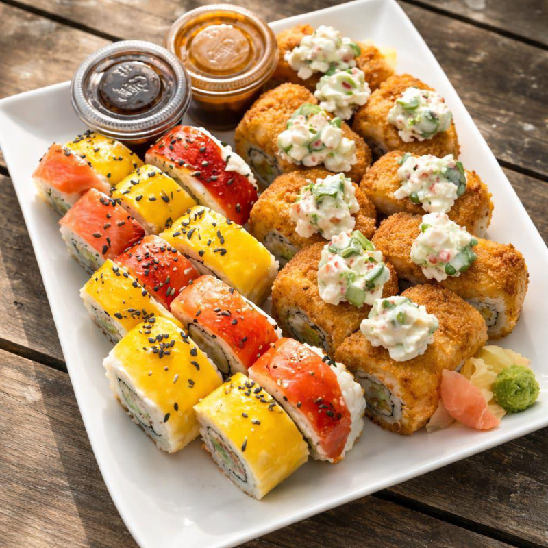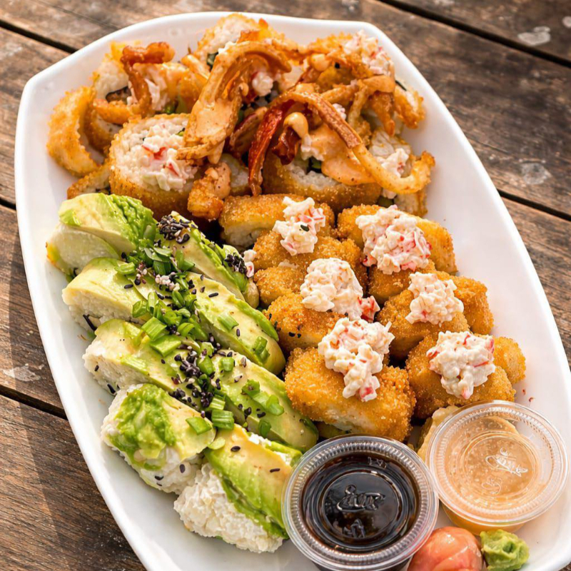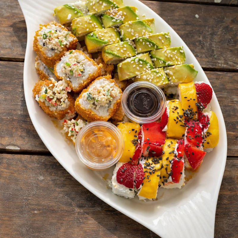 tres rollos rellenos de camaron y cangrejo entre frutales empanizados y el clasico sushi de aguacate