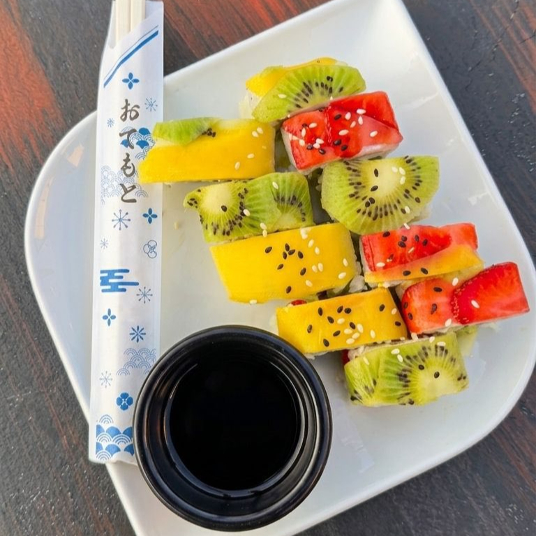 rollo relleno de surimi y por fuera fruta de temporada mas un rollo empanizado de camaron y por fuera ensalada tampico