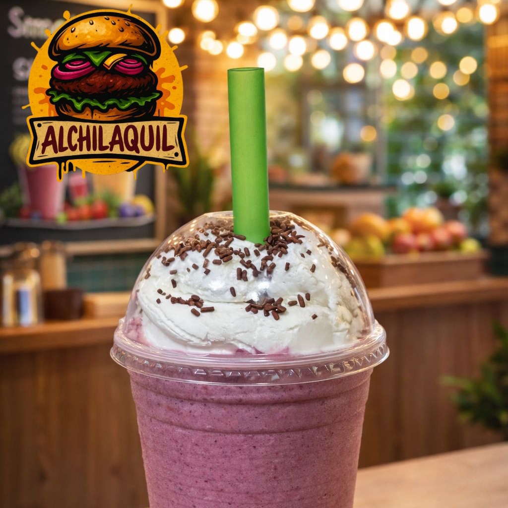 Licuado de frutos rojos naturales, elaborado con leche deslactosada, vainilla y azucar.