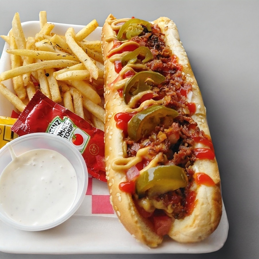 Salchicha 20 cm, pan con ajonjolí, papas francesa especiadas, tocino dorado, mostaza miel, capsu, jitomate, cebolla, chiles jalapeños.