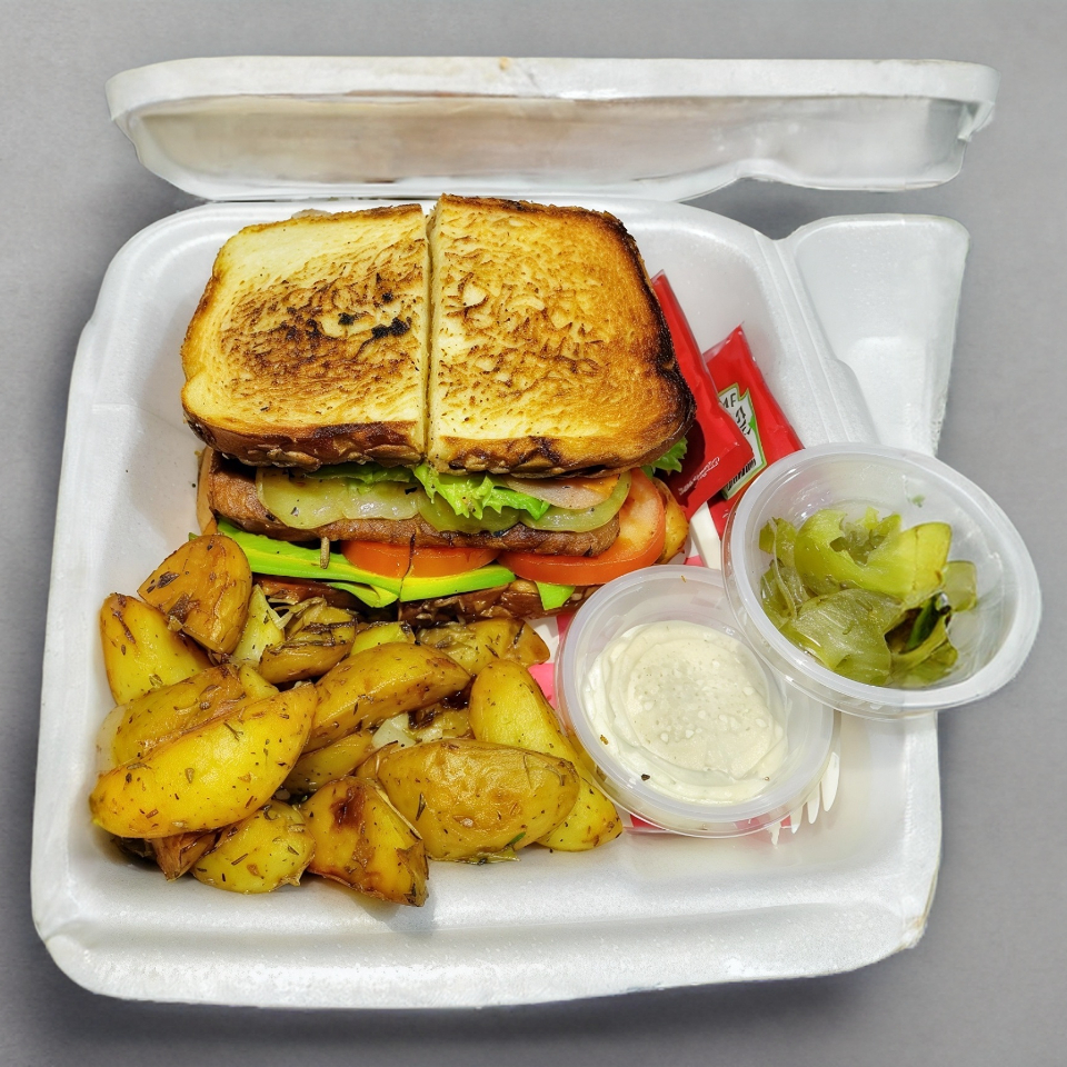 Carne de sirlon,aderezo chipotle, aguacate, jitomate, queso manchego, lechuga, Jamón. (Acompañado de papas cambray a las Finas hiervas)