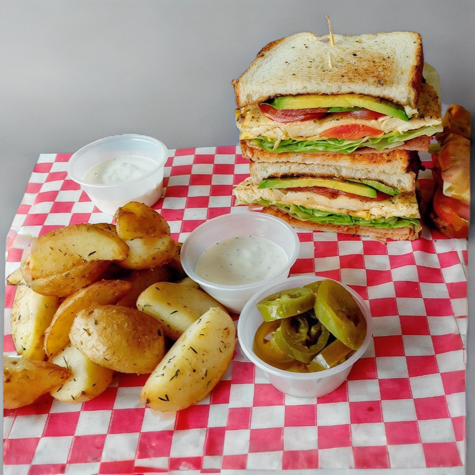 Pechuga de pollo a la plancha, Aderezó chipotle, aguacate, jitomate, queso manchego, lechuga, Jamón. (Acompañado de papas cambray a las Finas hiervas).
