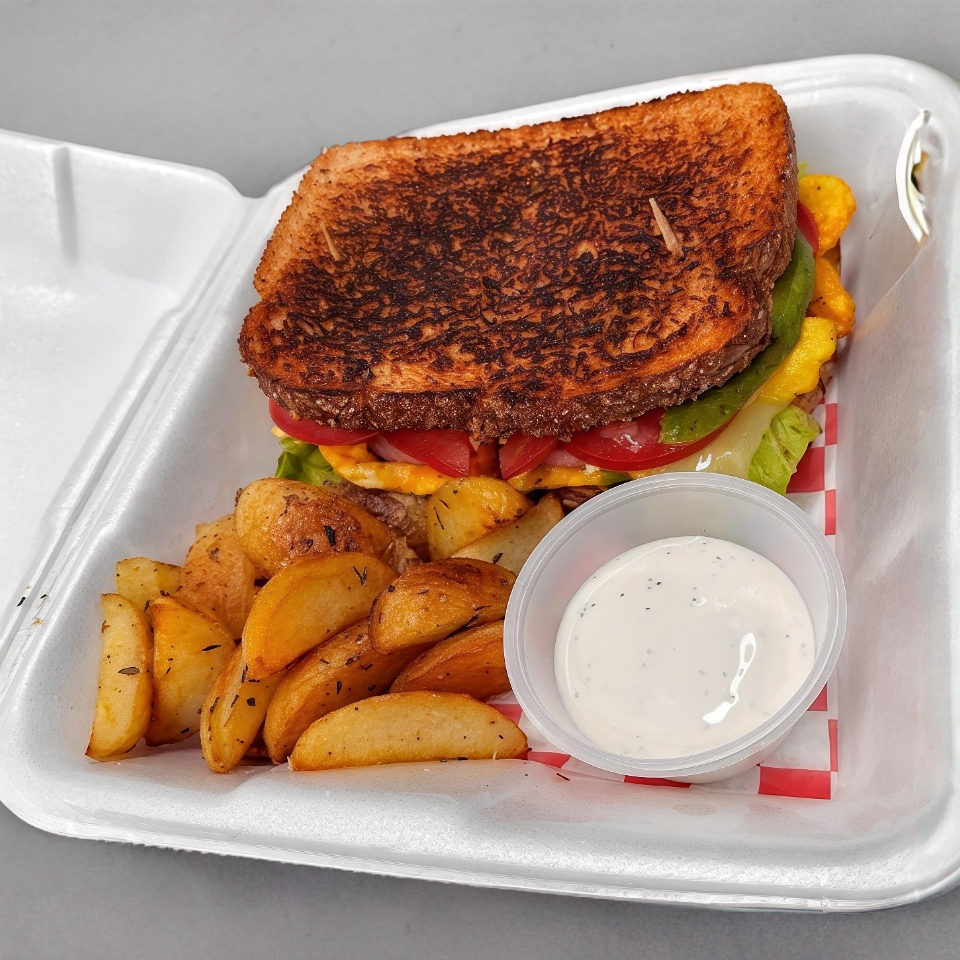 Omelet relleno de queso manchego y jamon, Aderezo chipotle, aguacate, jitomate, lechuga.(Acompañado de papas cambray a las Finas hiervas)