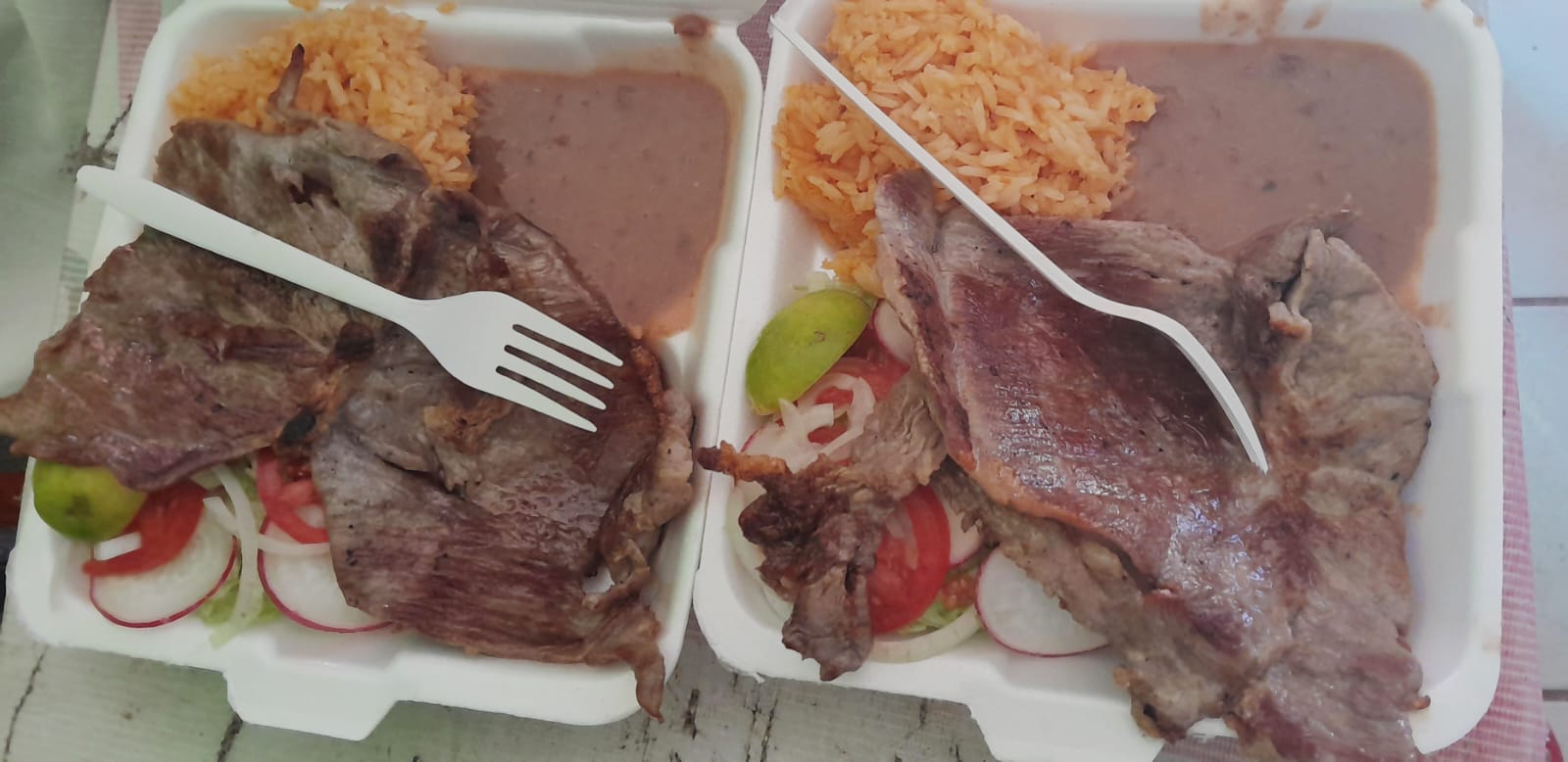 Cecina frita acompañada de arroz, frijol y ensalada.