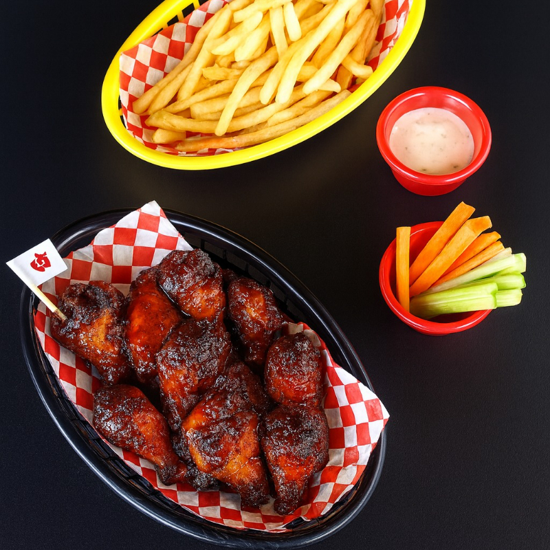 5 Alitas, una salsa elegir salsa, papas fritas, aderezo elegir ranch o blue cheese, apio o zanahoria.
