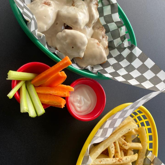 10 Boneless, dos salsas elegir salsas, papas fritas, aderezo elegir ranch o blue cheese, apio o zanahoria.