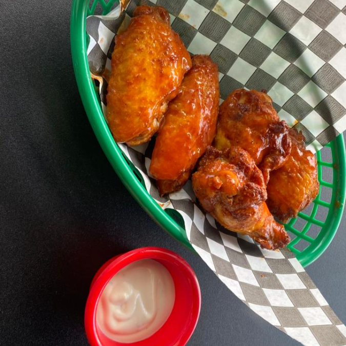 5 Alitas, una salsa elegir salsa, aderezo elegir ranch o blue cheese, opcional apio o zanahoria.