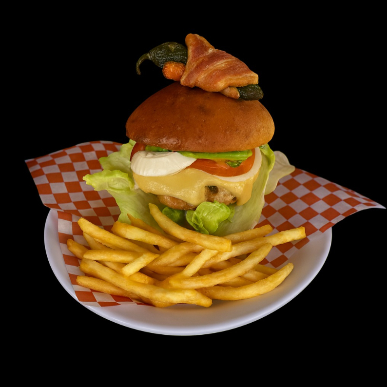 Hamburguesa con sirloin, 150 g de sirloin, pan artesanal, queso manchego, arúgula, lechuga, jitomate y cebolla, papas fritas, chile jalapeño enrollado en tocino.