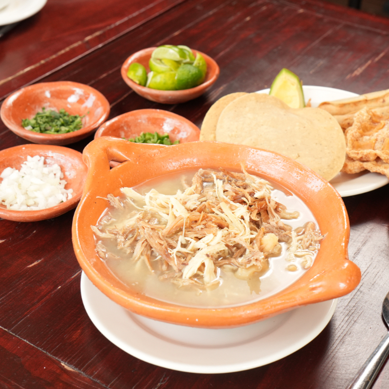 Pozole tradicional guerrerense de cerdo, pollo o mixto, servido con tostadas, tacos dorados, chicharrón y guarniciones frescas.