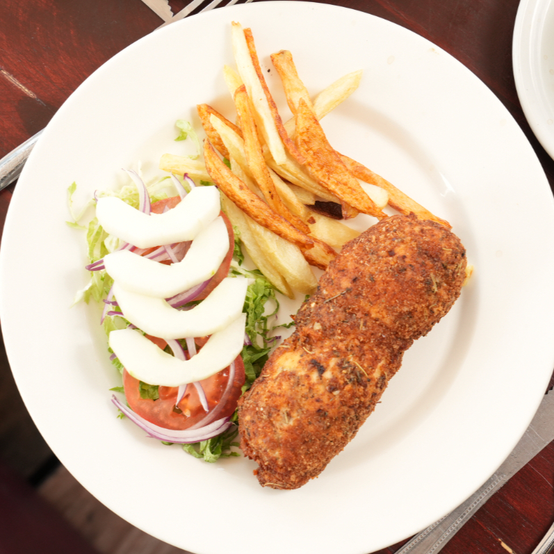 Milanesa empanizada al momento, dorada y crujiente, acompañada de arroz y ensalada fresca.