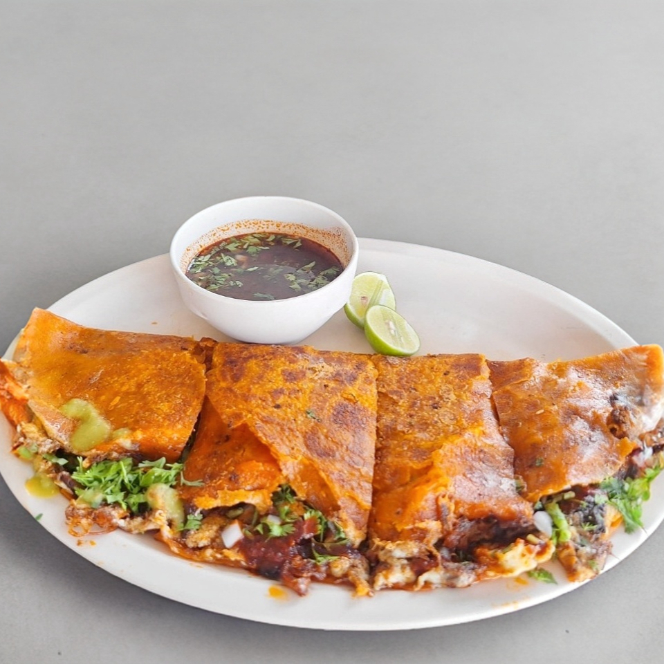 Pan bien doradito a la plancha, consta de queso chihuahua, jugosa porción de carne, con verdura, acompañada de un delicioso consomé.