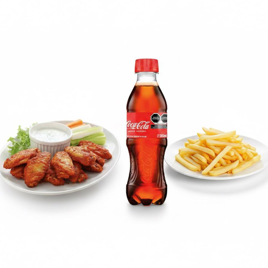 Disfruta 6 alitas de pollo jugosas y llenas de sabor, acompañadas de una porción de papas a la francesa crujientes y un refresco bien frío. un combo completo, práctico y perfecto para cualquier antojo. ideal para disfrutar a cualquier hora.
