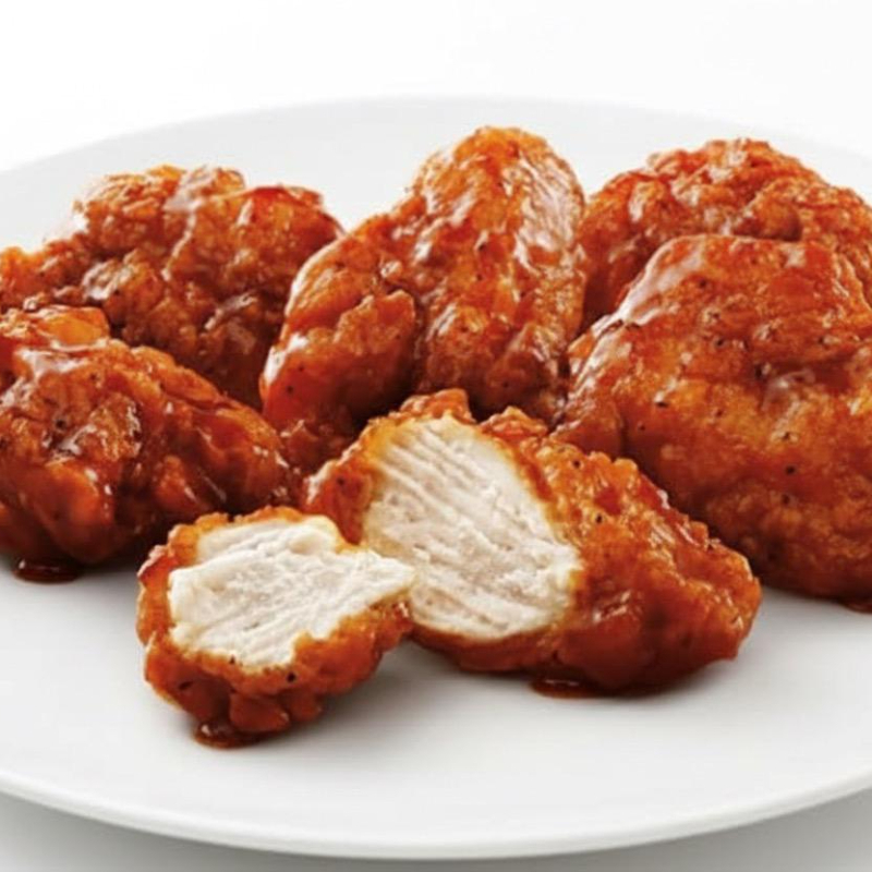 Tiernos trozos de pechuga de pollo empanizados y bañados en tu salsa favorita. porción perfecta para un antojo o comida ligera.