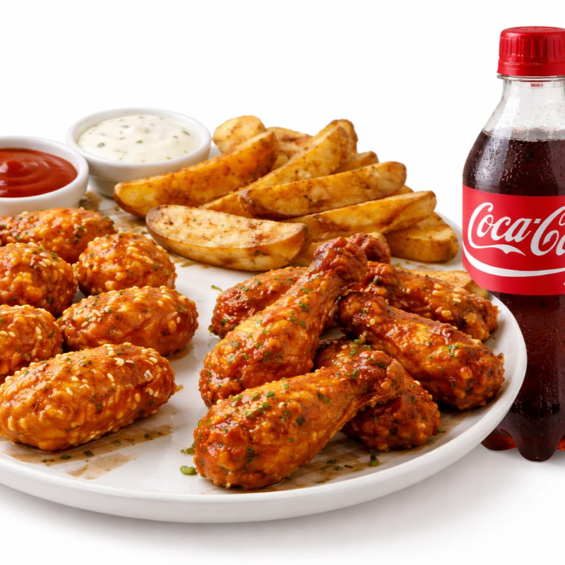 Combo perfecto para los que quieren de todo: 10 boneless crujientes y jugosos, 6 alitas con tu salsa favorita, una porción de papas gajo doradas y bien sazonadas, más un refresco para acompañar. abundante, variado y lleno de sabor. ideal para compartir o disfrutar sin límites.