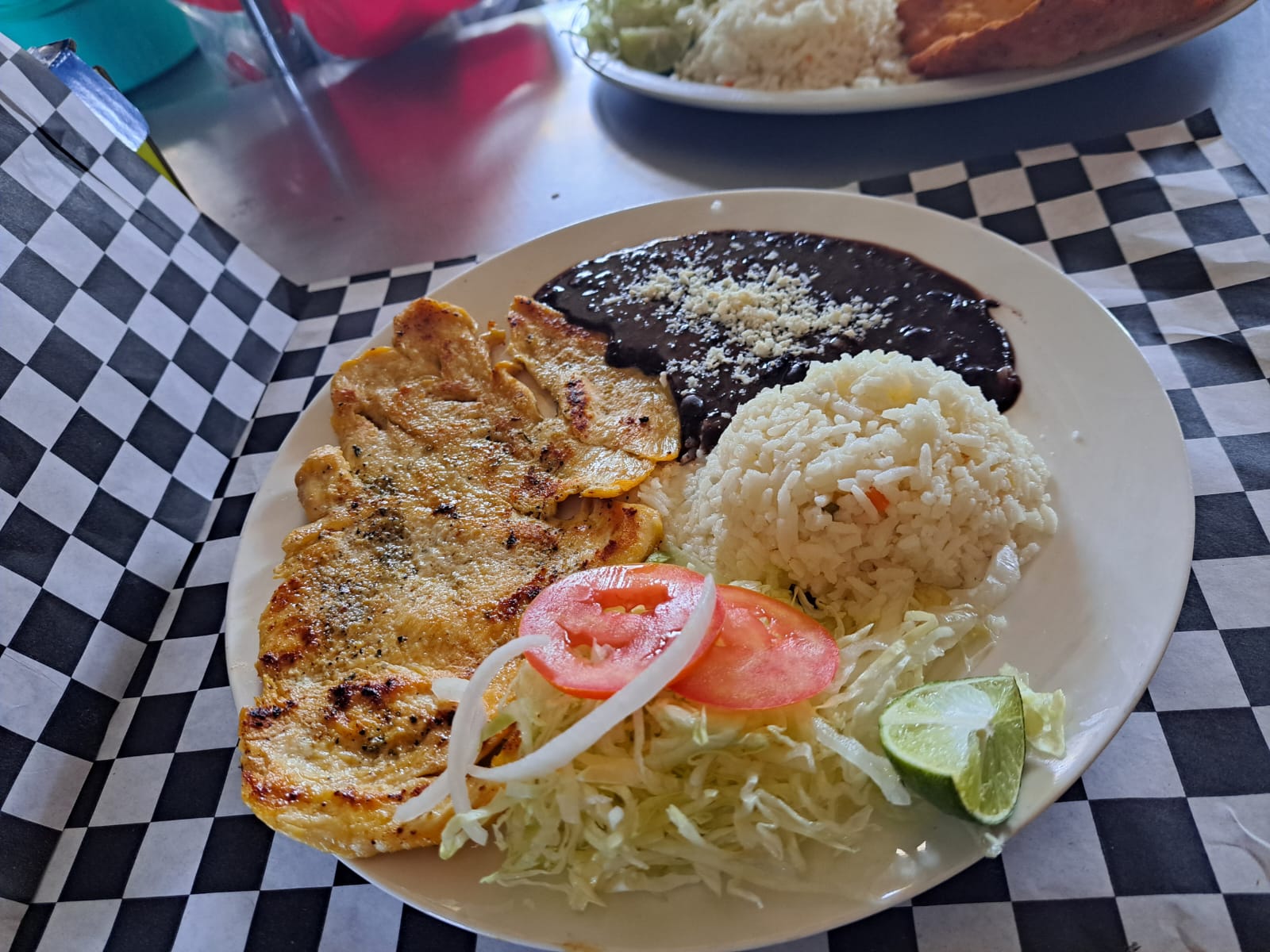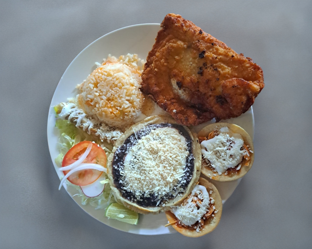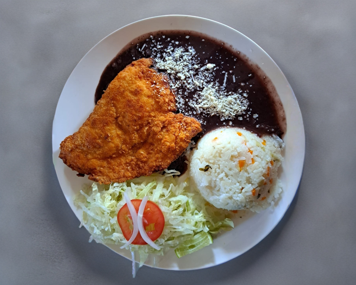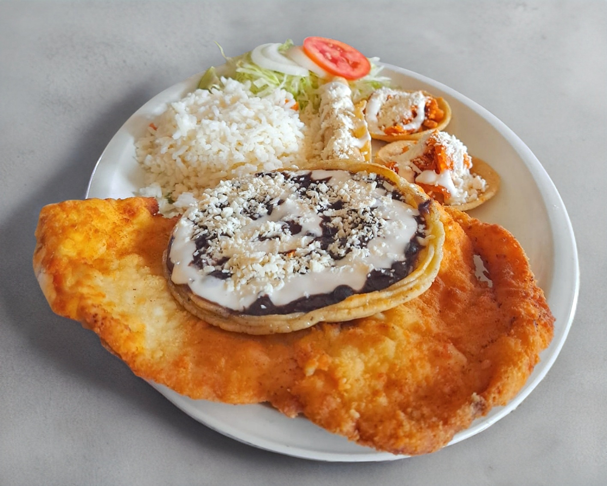 milanesa de pollo, acompañada con 2 enchiladas,1 taco dorado,1 sope de frijol, sopa de arroz, verdura(jitomate,cebolla),romanita) tortilla de comal