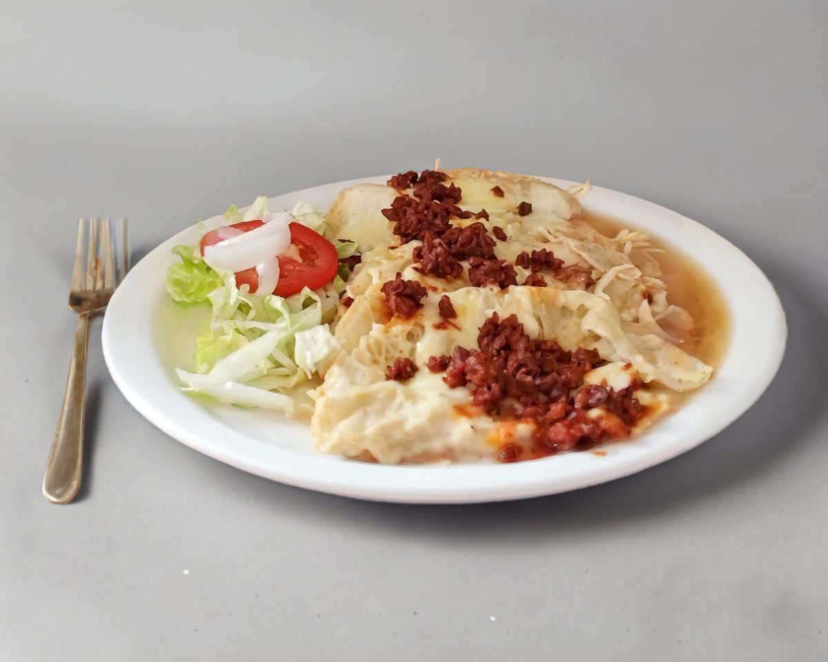 Ord.de 4 pzas, rellenas de pollo,bañadas en salsa,acompañadas de verdura(romanita,jitomate,cebolla)