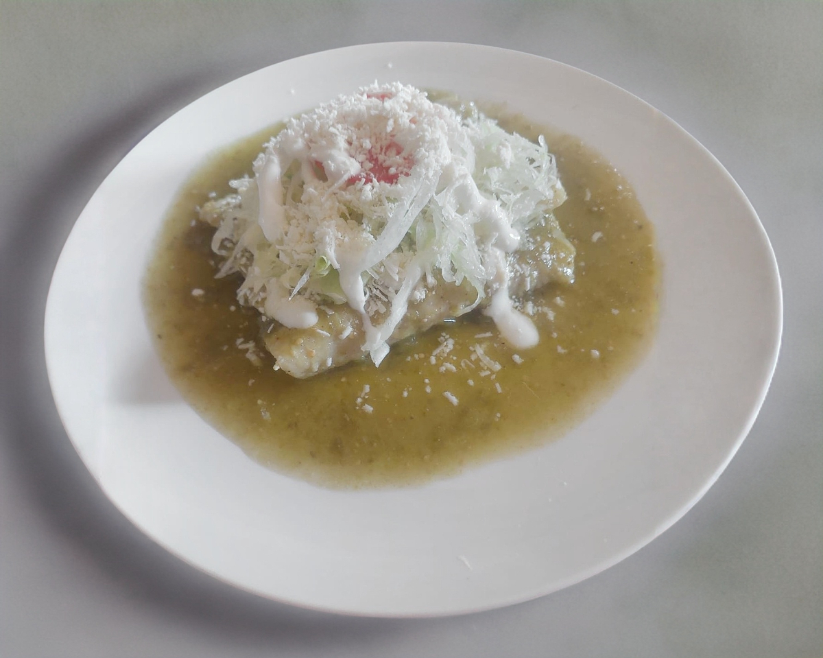 Rellena de jamon con queso oaxaca, acompañada de 2 enchiladas verdes, 1 taco dorado, 1 sope de frijol, sopa de arroz, verdura (romanita,jitomate,cebolla) tortilla de comal. (Porción personal)