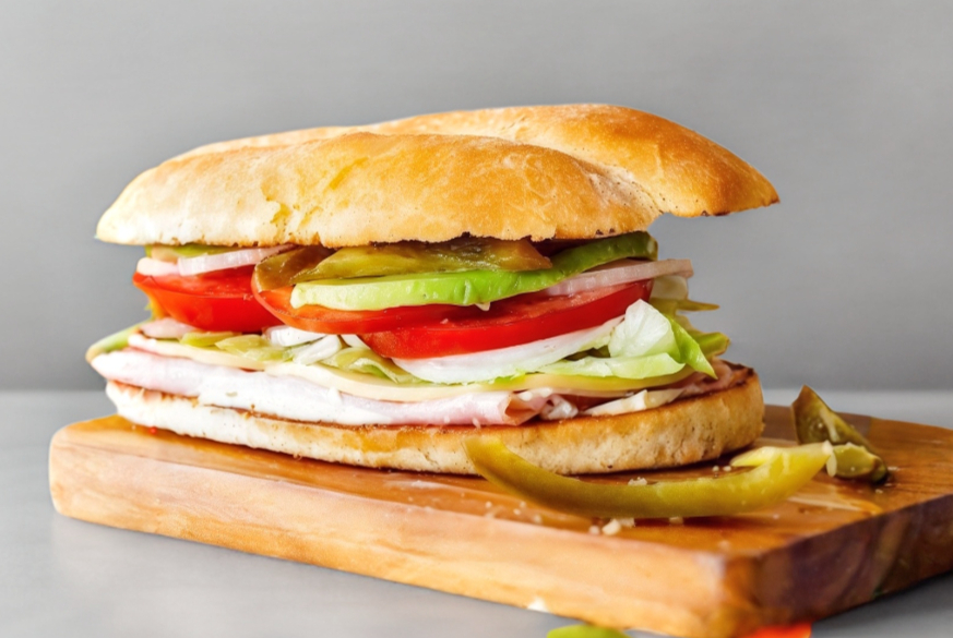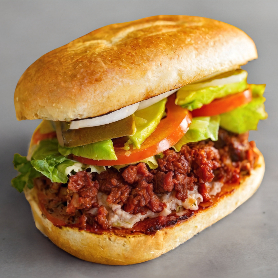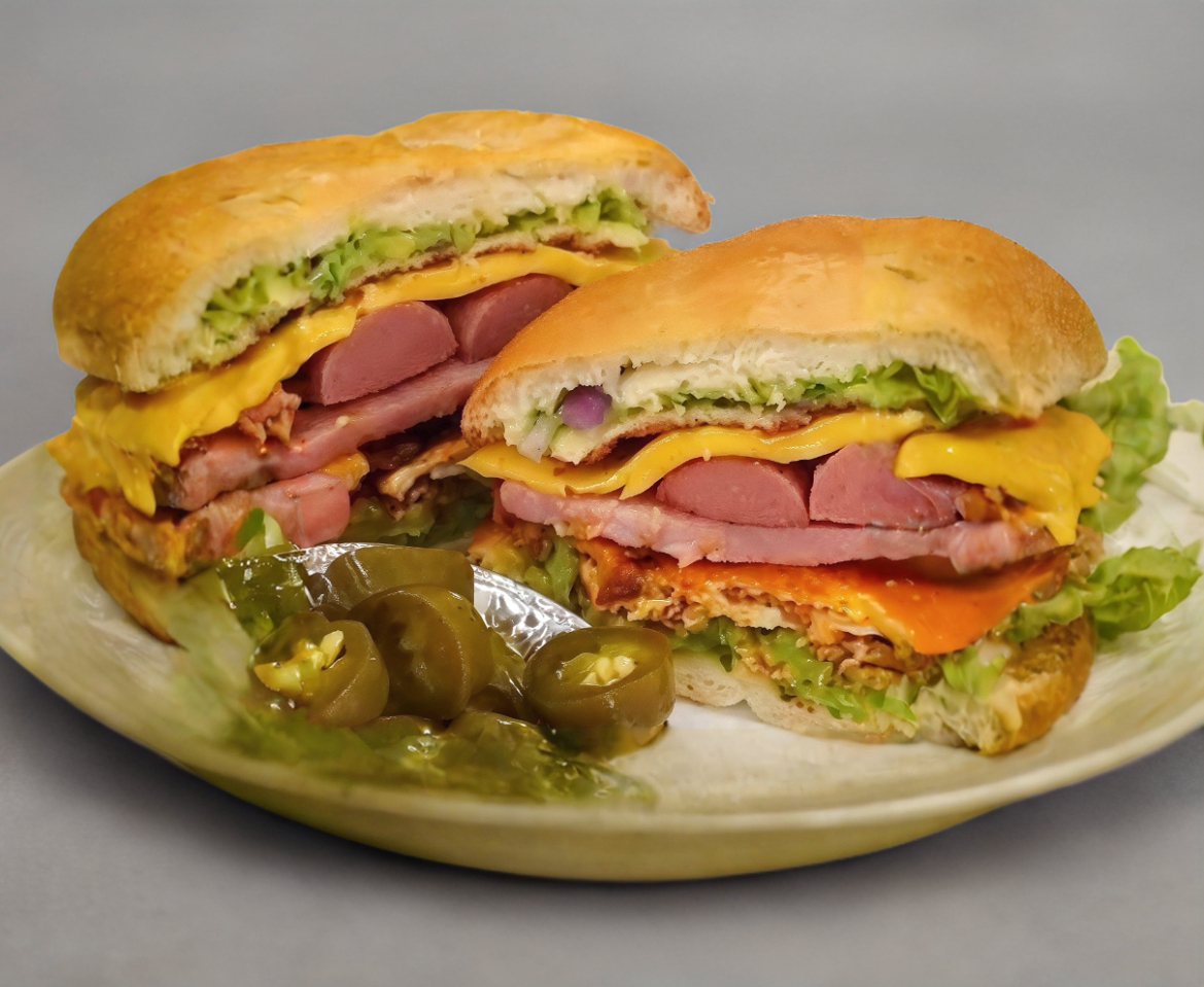 Ingr. Carne sirloin, quesos americano y manchego, lechuga italiana, jitomate, cebolla y chile envinagre.