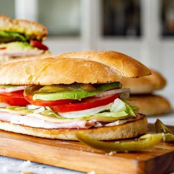 Ingr. Jamon, queso americano, lechuga, jitomate, cebolla y chile en vinagre.
