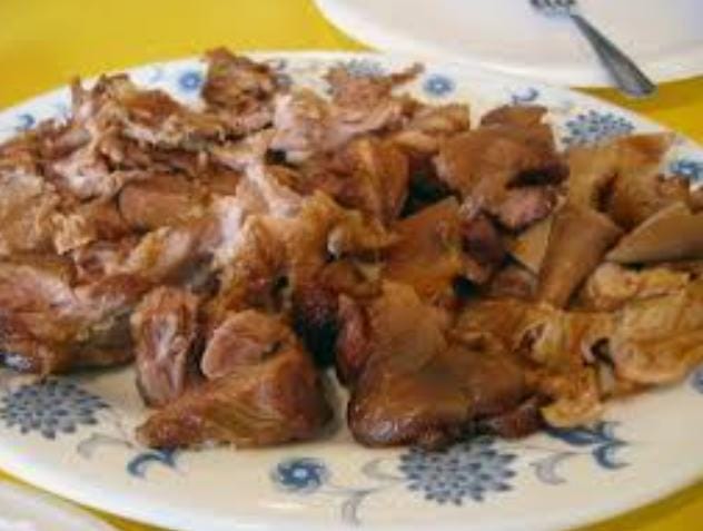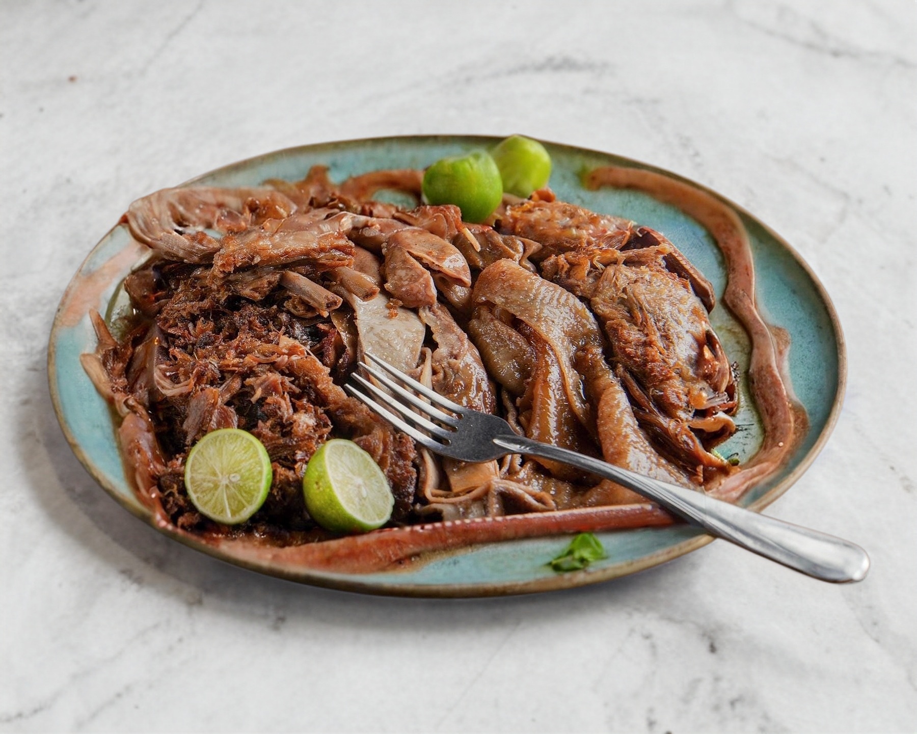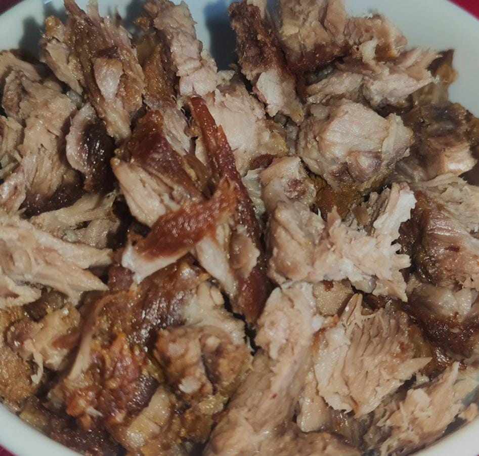 Cuarto de kilo de carne especial (maciza, cuero y costilla). Incluye salsa verde, roja, cebolla, cilantro, limones y tortillas.