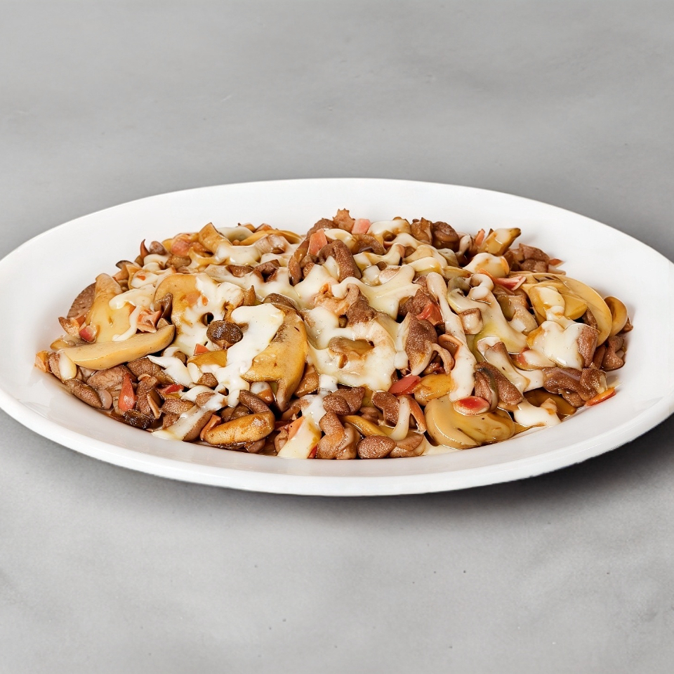 Chuleta, champiñón, cebolla y queso gratinado. Acompañado de tortillas, salsas, cebollitas, rábanos y limones.