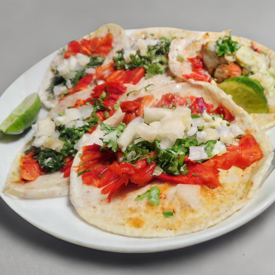 (Pastor, chuleta y queso gratinado en 3 tortillas de harina) Acompañado de salsas, cebollitas, rábanos y limones.