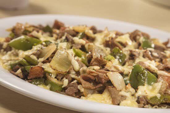 Chuleta, cebolla, pimiento morrón y queso gratinado. Acompañado de tortillas, salsas, cebollitas, rábanos y limones.