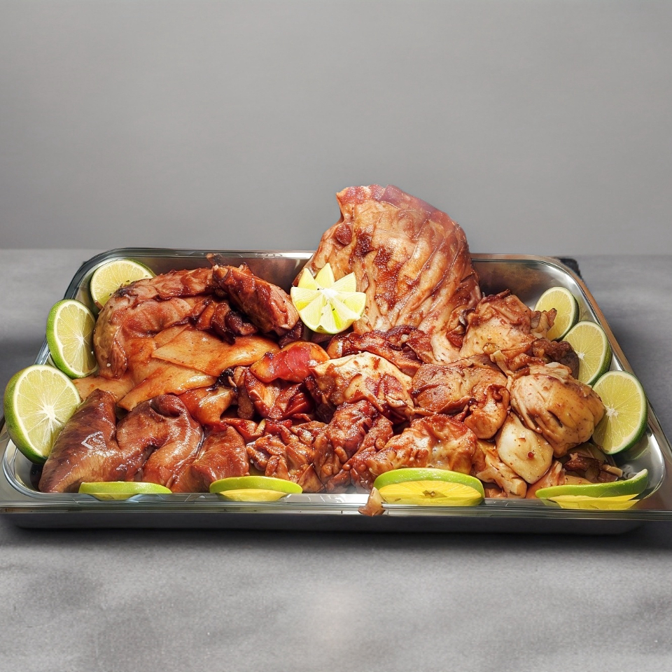 Pastor, chuleta, chorizo, cebolla, pimiento morrón, tocino y queso gratinado. Acompañado de tortillas, salsas, cebollitas, rábanos y limones.