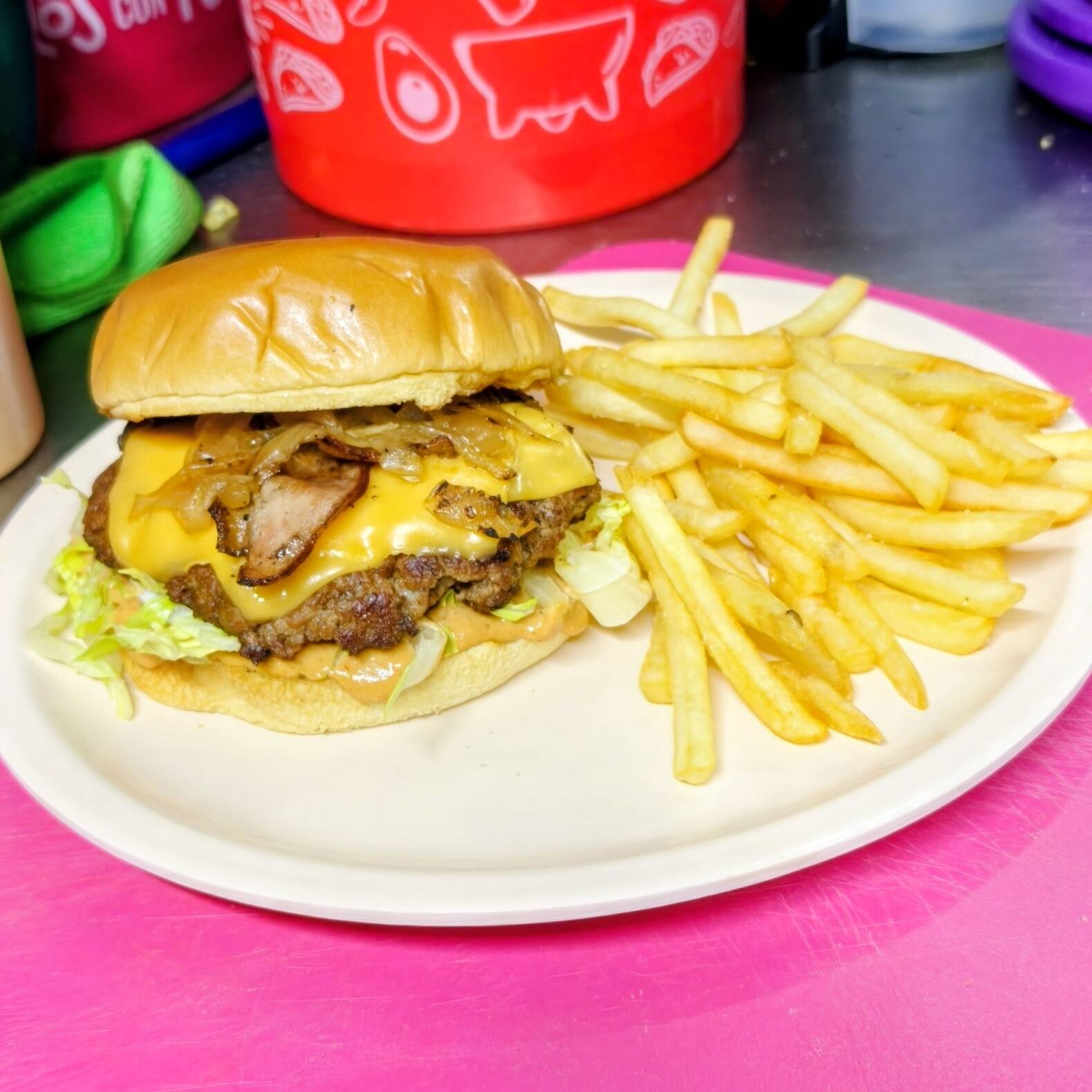 Pan brioche, 150 g de carne molida, queso americano, cebolla caramelizada, tocino, mayonesa, lechuga, jitomate y aderezo especial de la casa.