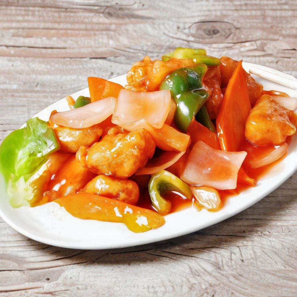 Cerdo rebosado con zanahoria, cebolla, morrón, bañados en salsa agridulce.