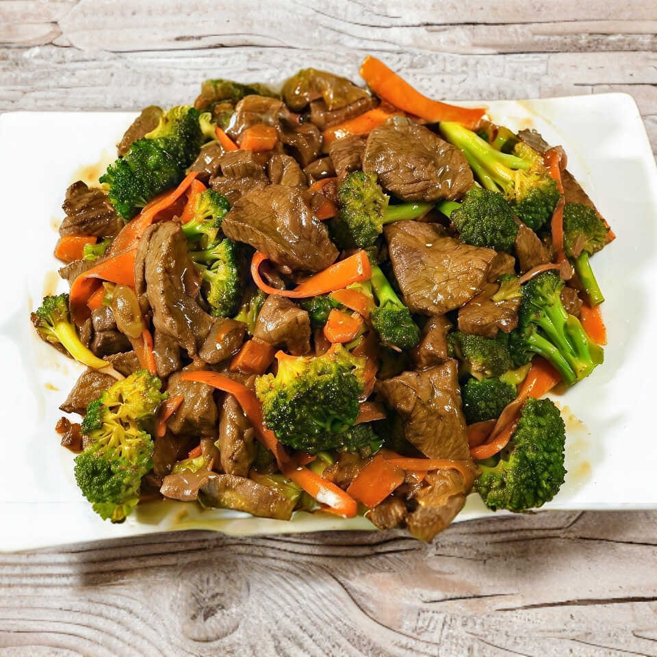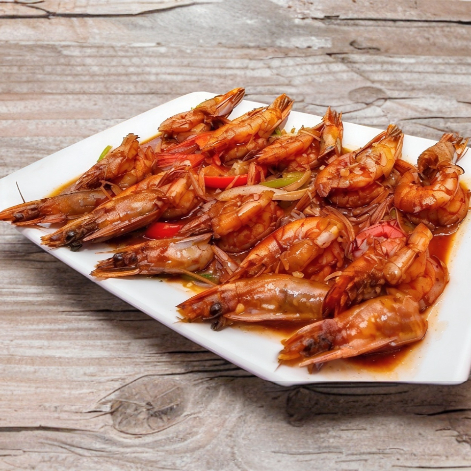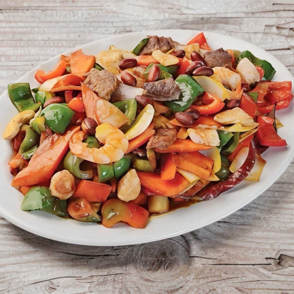 Camarón, pollo, res y verduras salteadas en salsa obscura oriental.