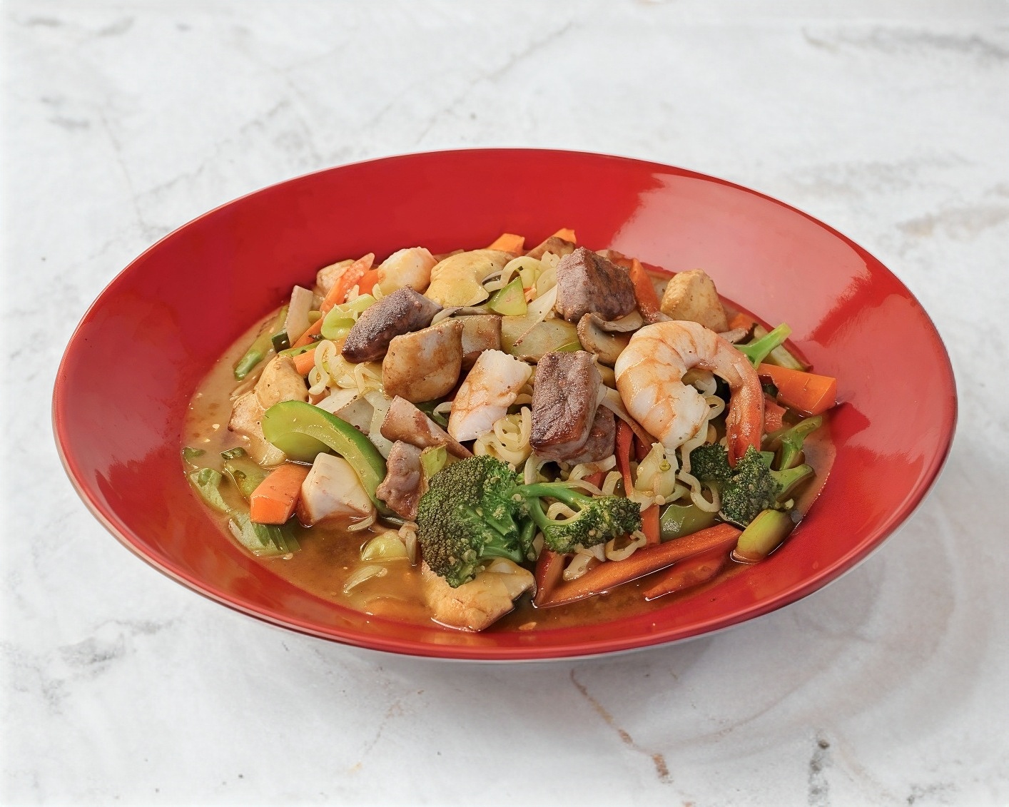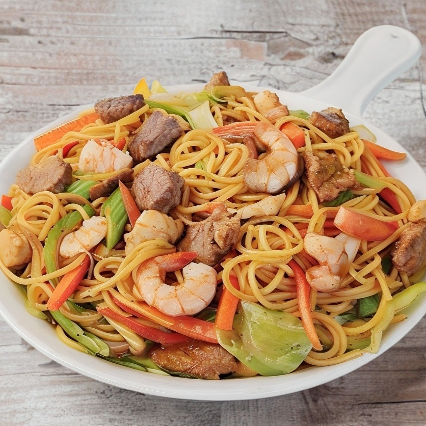 Pollo, res y camarón, pasta salteada con verduras.