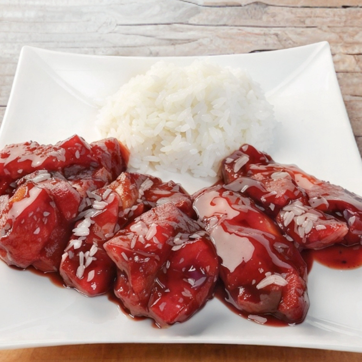 200 g De costillas de cerdo glaseadas en salsa BBQ, acompañadas de arroz blanco.