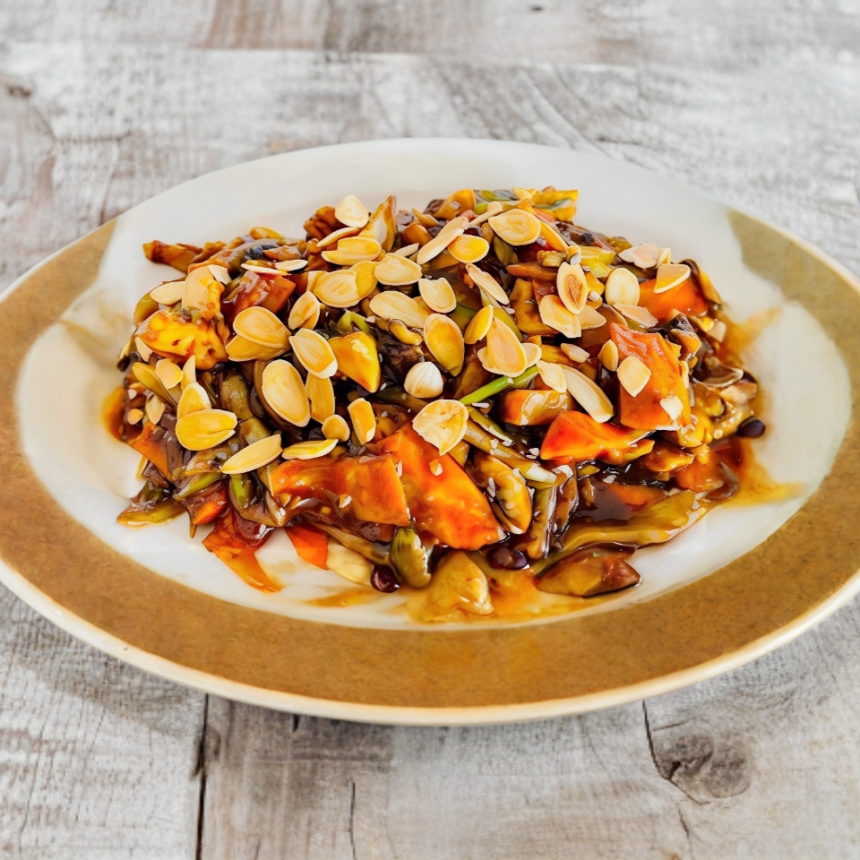 Champiñones, apio, jícama, almendra en salsa obscura.