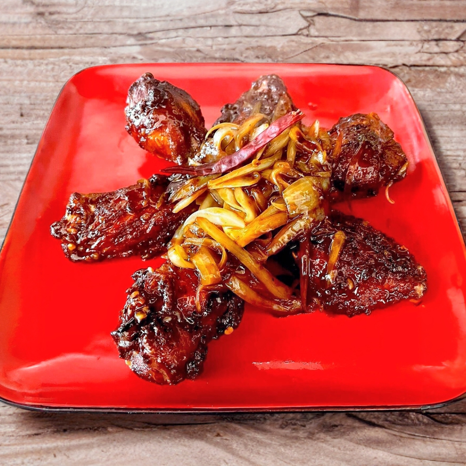 6 Piezas de alitas de pollo acompañadas de cebollitas y una salsa oriental picante.