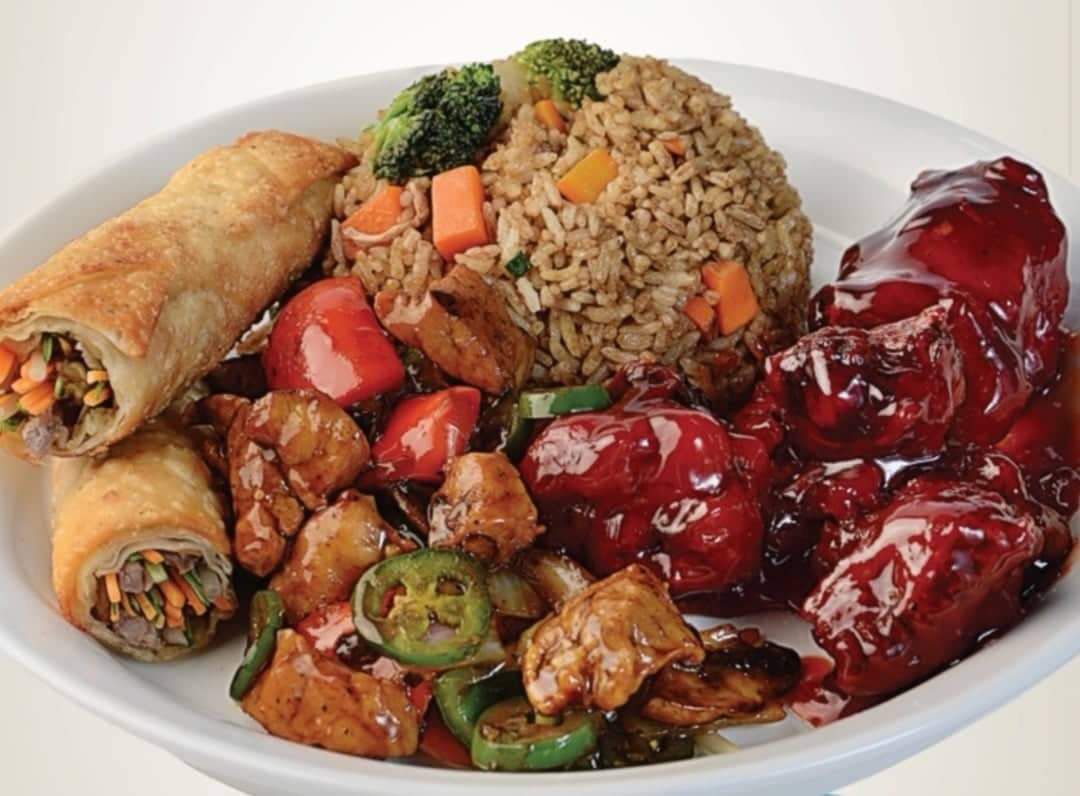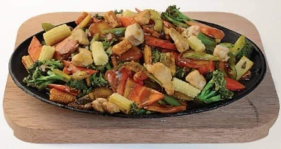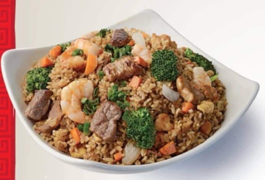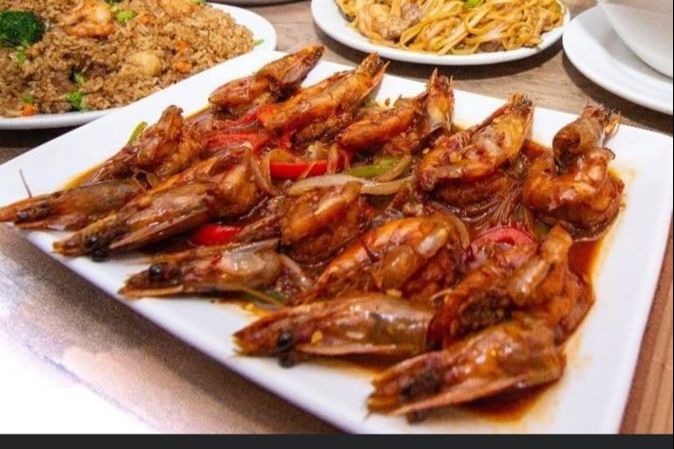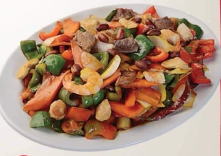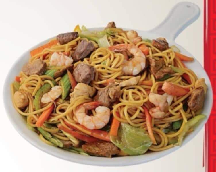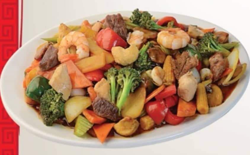 Camarón, pollo, res y verduras salteadas en salsa obscura oriental.