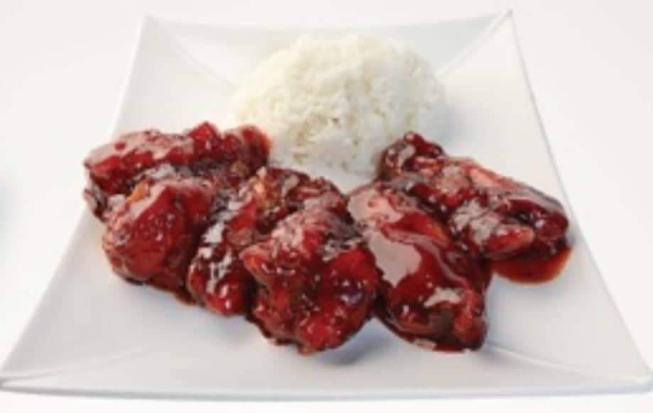 Pollo frito, bañado con salsa a la bbq con un toque oriental y acompañado de arroz al vapor.