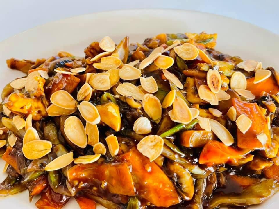 Champiñones, apio, jicama, almendra en salsa obscura.