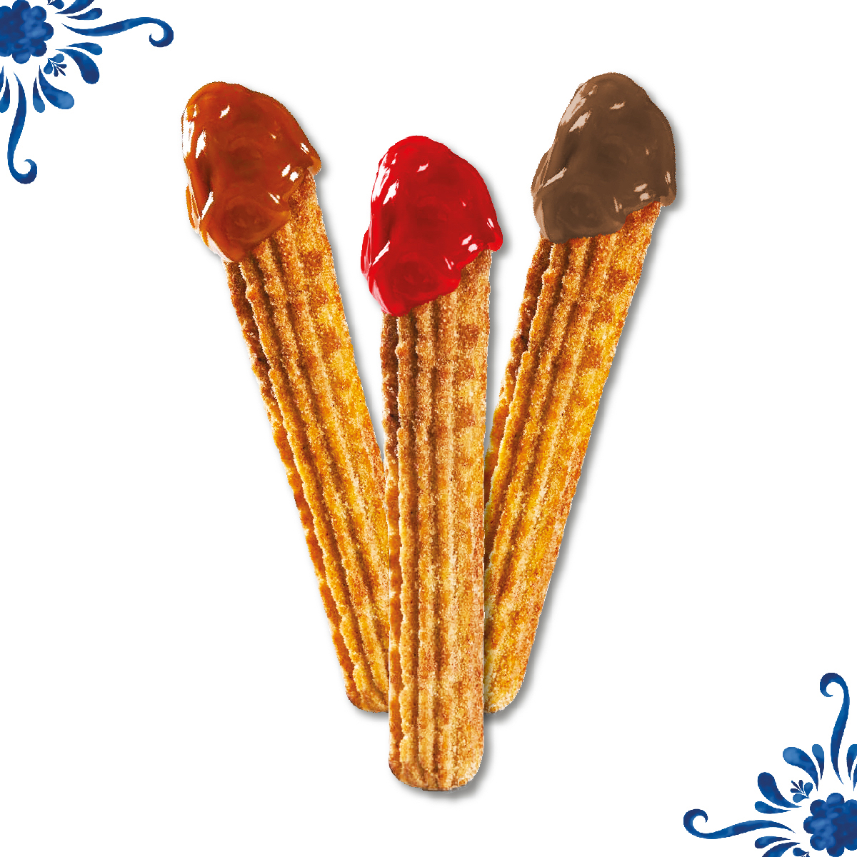 3 piezas de churros de 20 cm rellenos con una variedad de jarabes, ofreciendo un toque especial en cada bocado.