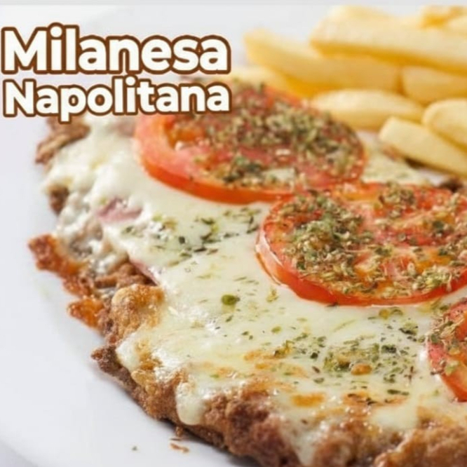 Milanesa Napolitana Suprema Descripción: Nuestra milanesa de carne o puedes pedirla de pollo premium, perfectamente empanizada y crujiente, va cubierta con una capa de queso fundido, rebanadas de tomate natural y un toque especial de orégano que realza su aroma. Acompañamiento: Servida con una abundante porción de papas a la francesa, doradas y en su punto de sal.