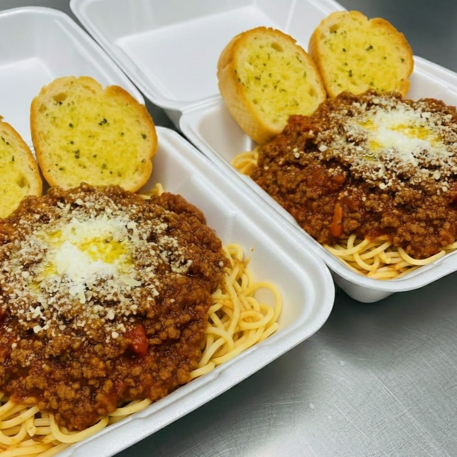 2 espagueti con salsa bolognesa acompañado de pan con ajo2 espagueti con salsa bolognesa acompañado de pan con ajo