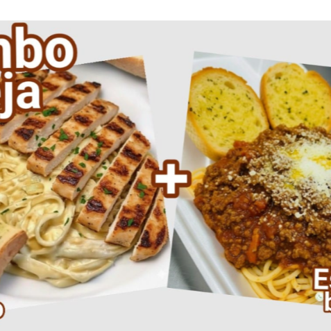 Alfredo & Boloñesa Descripción: ¿No te decides? ¡Lleva los dos! Nuestro combo incluye una rica Pasta Alfredo con pollo a la parrilla y un Espagueti Boloñesa con auténtico sabor casero. La combinación ideal que incluye pan de ajo para complementar cada bocado. ¡Listo para disfrutar en casa!