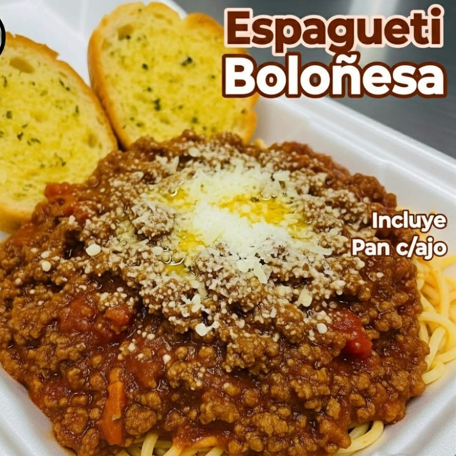 Espagueti Boloñesa con Pan de Ajo Descripción: Pasta larga con salsa boloñesa rica en carne y queso parmesano. Servido con dos piezas de pan de ajo artesanal. ¡Perfecto para una comida completa y deliciosa!